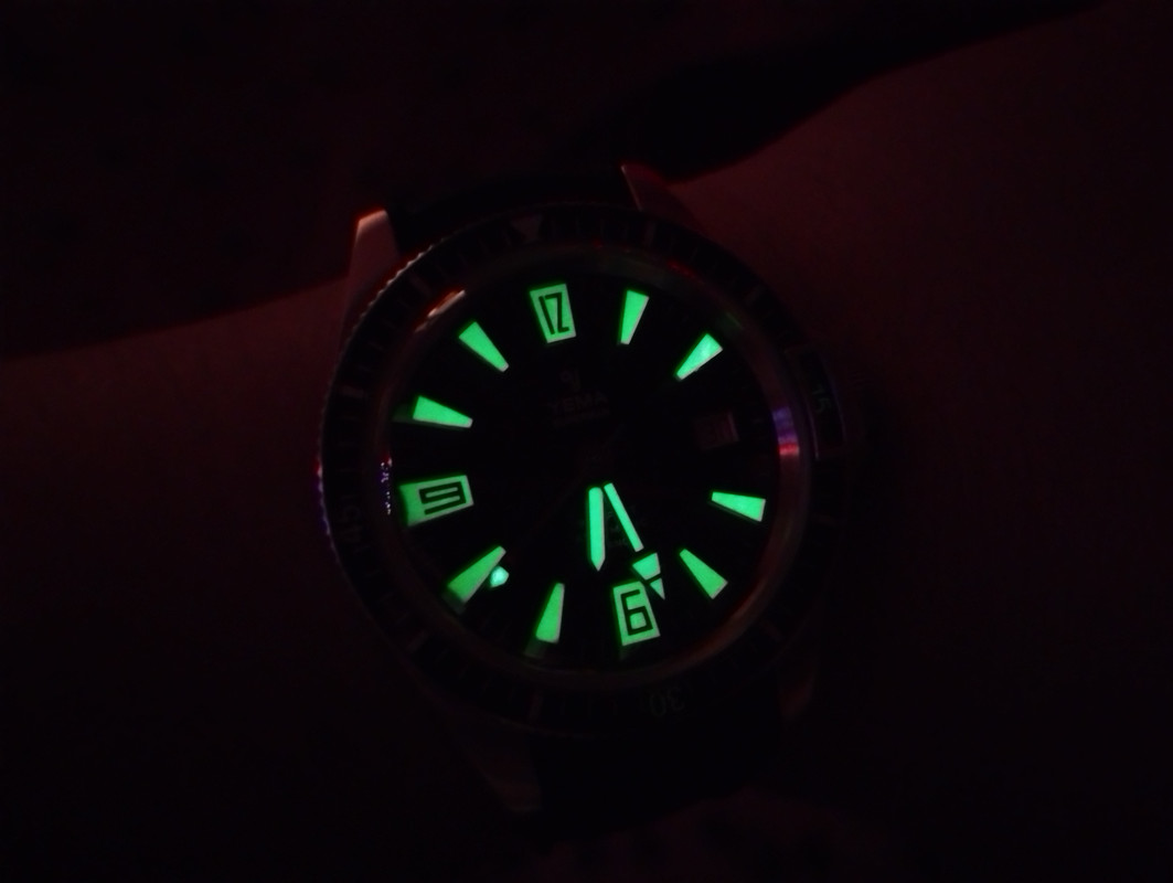 Στις φωτό δεν είναι απόλυτα ξεκάθαρο, αλλά στο σκοτάδι τα μόνα πράγματα που φωσφορίζουν είναι ο ωροδείκτης, ο λεπτοδείκτης, οι τέσσερεις αριθμοί και οι ενδείξεις των ωρών.