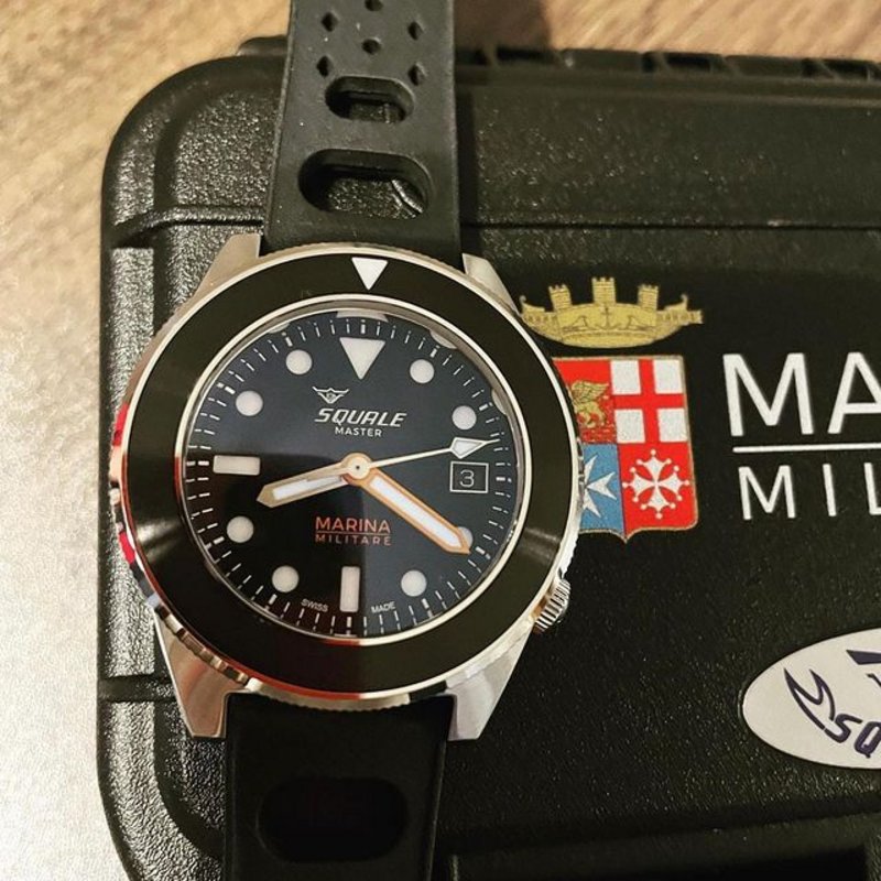 Squale Master Marina Militare 120 Bar. Η σύνδεση με το Ιταλικό Ναυτικό χρονολογείται από τη δεκαετία του 1980 όταν η Squale κέρδισε δύο φορές το συμβόλαιο για την προμήθεια ρολογιών για το Divers Group της La Spezia. Για εκείνες τις περιπτώσεις, ειδικά ρολόγια Squale σχεδιάστηκαν και κατασκευάστηκαν σύμφωνα με τις συγκεκριμένες απαιτήσεις του ίδιου του Πολεμικού Ναυτικού.Ετσι 40 χρόνια μετά την ιστορική συνεργασία, το ναυτικο και η Squale αποφάσισαν να ανανεώσουν αυτή την επαγγελματική συνεργασία, δημιουργώντας ένα ρολόι περιορισμένης έκδοσης μόνο 300 ρολογιών