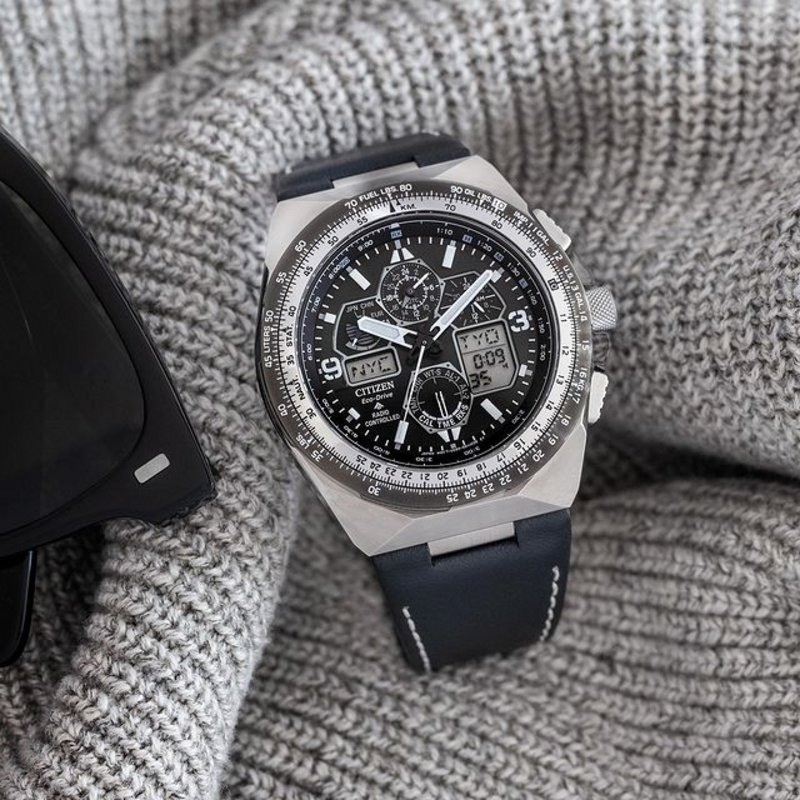 Soaring at 36,000 feet, every day is sweater weather, and our newest Promaster Skyhawk A-T is at the height of style and function. Feature-rich and ready to take flight, this pro-level pilot watch has a slide-rule bezel, UTC time, Atomic-Timekeeping, digital and analog displays, and is water resistant up to 200 meters