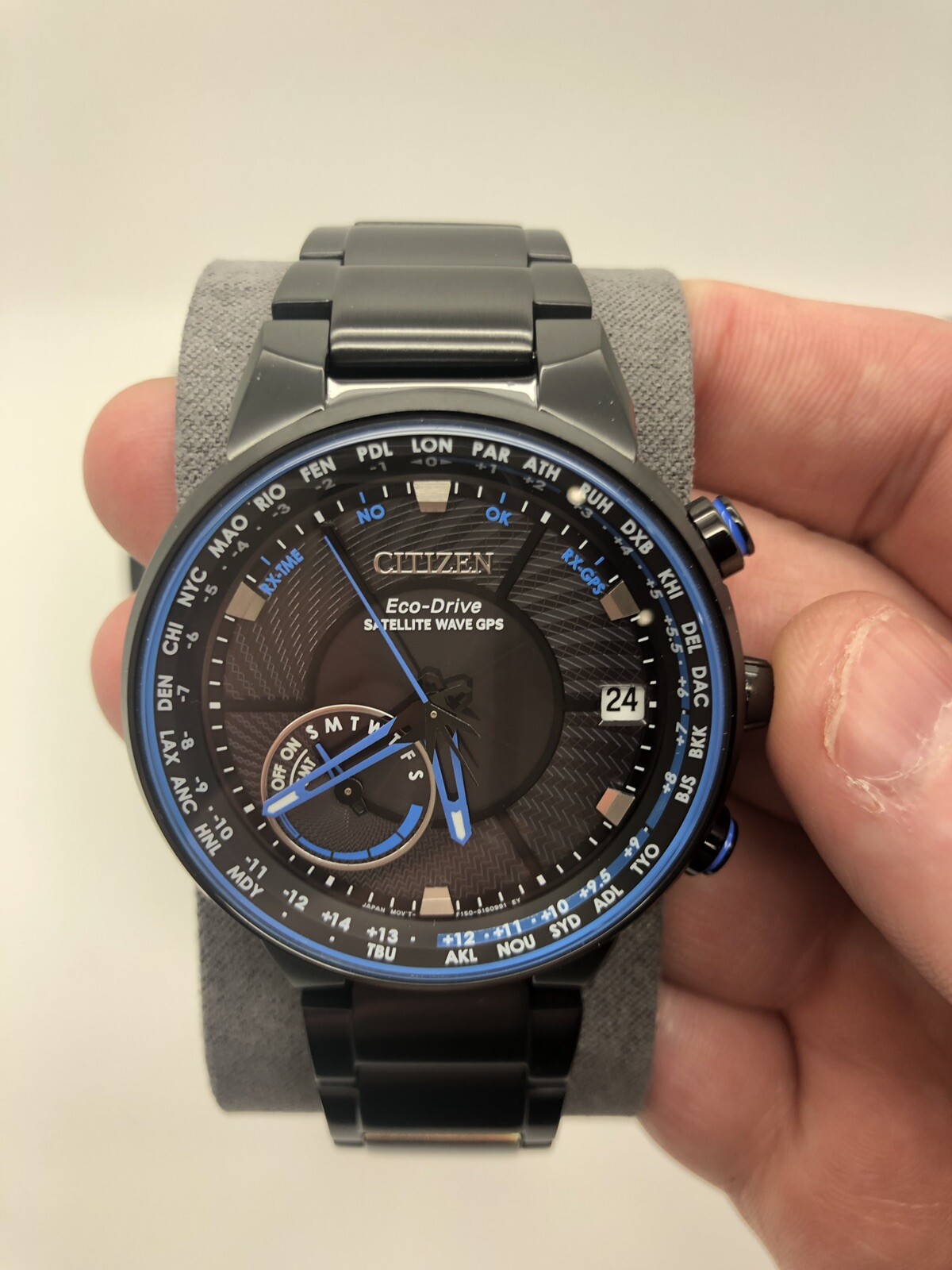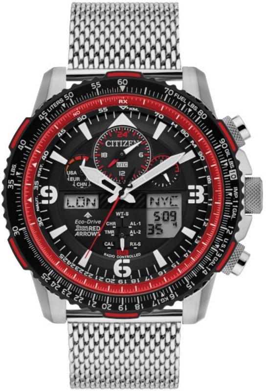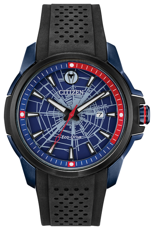 44mm black ion-plated stainless steel case with blue chroma-finish, black silicone strap, vibrant blue dial with web designs and red accents with date. Eco-Drive movement.