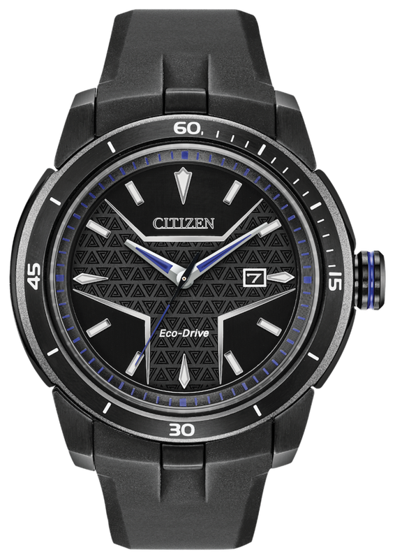 47mm black ion-plated stainless steel with black chroma finishing, black silicone strap, black Wakanda tribal print dial and date. Eco-Drive movement.