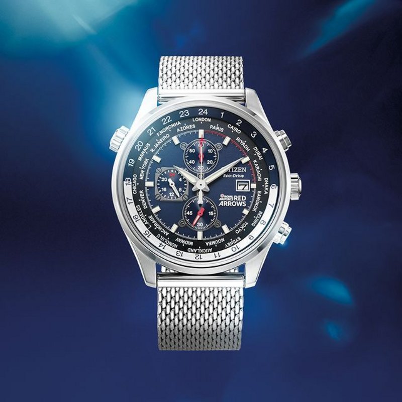From the Citizen Red Arrows collection, styled with a blue dial with red accents and the official RAF Red Arrows logo. The look is completed with a stainless-steel mesh bracelet. Model: CA0081-78L