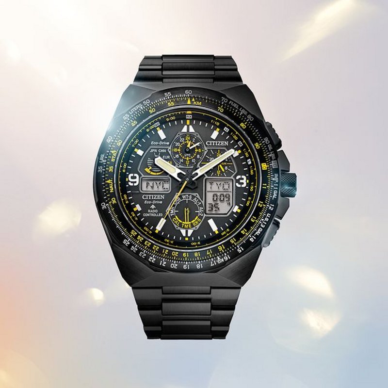 Ready for wherever life takes you, the Skyhawk A-T features a 1/100 second chronograph that measures up to 24 hours, world time in 43 cities, 12/24 hour time, perpetual calendar, 2 alarms and much more, as well as our sustainable Eco-Drive technology; powered by light, any light and never needs a battery. Model: JY8127-59E