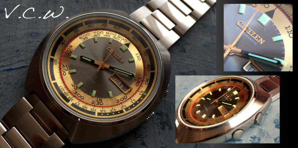 The dial is the main attraction of the watch. It is grey, with a sunburst effect. On the outside there is a golden ring with black digits. The golden ring is circled by a thin red zone delimitating the dial from the golden rotating bezel. The entire face of the watch is shiny and powerful. On the grey zone there is the applied Citizen logo, the white painted lettering “automatic 21 jewels”, the day and the date (sharing a single golden frame) and the applied luminous hour markers. The hands are painted, partially, in black with a luminous line. The sweeping second hand is not painted.