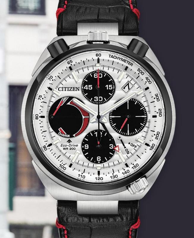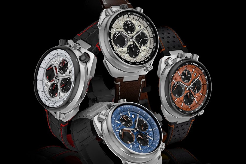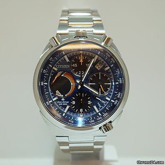 Movement is the Japanese in-house solar caliber Citizen E210. It is hand-assembled and features a 1/5-second chrono, alarm, tachymeter, instantaneous flyback function, and power reserve indication.