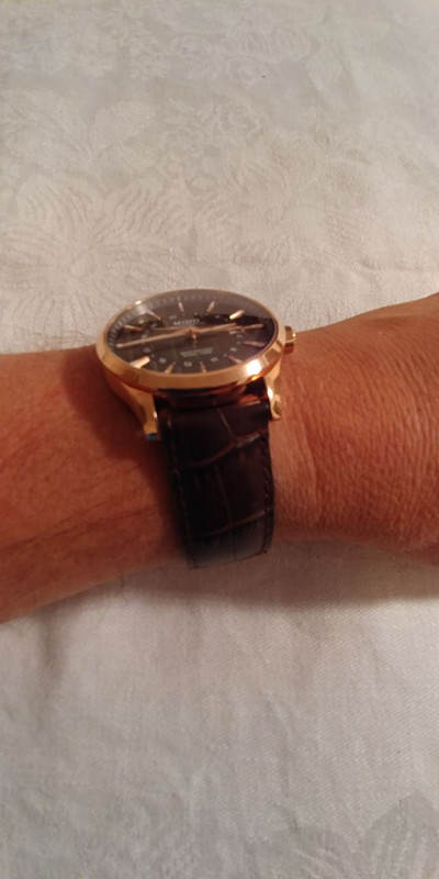 Κι εκεί το είδα να μου χαμογελάει , με το περίεργο καφέ ανάγλυφο dial του , τον GMT δείκτη και την χρυσή κάσα (μου αρέσει το ρολόι να έχει κάτι χρυσό)