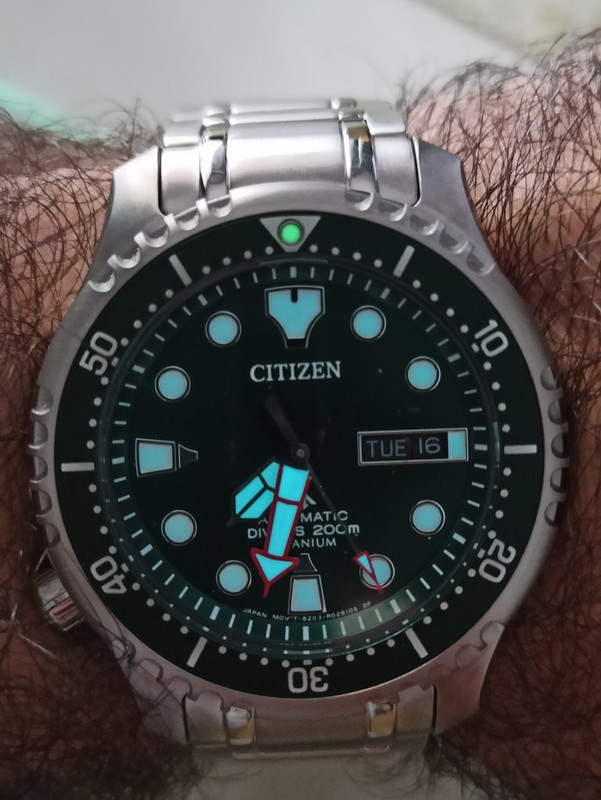 Αυτό που μου αρέσει όμως είναι η αντίθεση του πράσινου με τους κόκκινους δείκτες + υλικό τιτάνιο!!....το καλύτερο υλικό για τέτοιου είδους ρολόγια