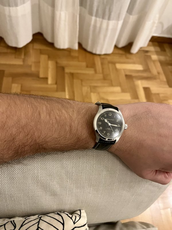 Στην πραγματικότητα είναι λίγο πιο μικρό σε σχέση με αυτό που φαίνεται στις φωτογραφίες ως προς τον καρπό...κλασσικό,μαζεμένο και κομψό.Εχει βουρτσισμένη κάσα,κάνει ωραία αντίθεση με τη γυαλισμένη στεφάνη, ψιλο-oversized κορώνα, ποιοτικό μαύρο αγελαδινό λουράκι σε στυλ κροκό.Οι cathedral δείκτες δένουν όμορφα . Ρολόι για αρχόντους  ;D