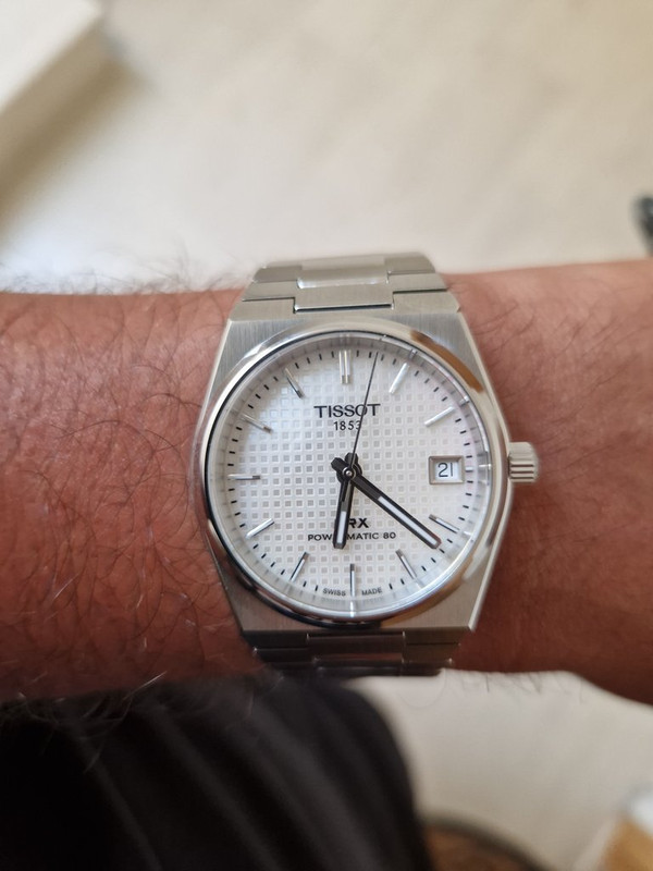 Ηρθε λοιπον σημερα το νεο TISSOT PRX 35 mm white dial "mother of pearl dial " δεν μπορω να σας δειξω ακριβως  το dial αλλα αναλογα πως το βαραει το φως κανει ενα πρασινο με μωβ χρωμα φενεται λιγο πανω δεξια και οταν δεν το βλεπει φως κανει καπως σαν καθρευτη τα μικρα τετραγωνα μεσα στο dial ... πολυ ανετο το bracelet στα λεφτα του πιστευω επρεπε να ειχε βιδες στα links και οχι push pins , το lume ειναι ελαχιστο αλλα ηταν αναμενομενο .Γενικα πολυ ευχαριστημενος.Στις φωτογραφιες φενεται πιο μεγαλο απο οτι δειχνει στις φωτο , το μεγεθος για αθτο το ρολοι στα 35 mm μου φενεται διανικο για το δικο μου καρπο στα 16 ,3 εκατοστα.