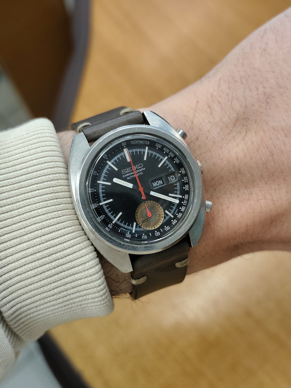 Επέστρεψα αυτή τη φορά μ' ένα ρολόι που έψαχνα καιρό. Ήθελα ένα 6139-6012, το λεγόμενο Bruce Lee, είτε με κίτρινο καντράν, είτε με αυτό το μαύρο που πήρα εντέλει. Αφού το βρήκα σε αξιοπρεπή κατάσταση, με πρόσφατο σέρβις και καλή τιμή, το πήρα χωρίς να το πολυσκεφτώ και πραγματικά έχω κατενθουσιαστεί. Δεν έχει μπρασελέ βέβαια, αλλά αυτό το χειροποίητο δερμάτινο λουρί νομίζω πως του πηγαίνει αρκετά, προσδίδοντάς του ένα χαρακτήρα ακόμα πιο βίντατζ. Παρ' όλ' αυτά παρήγγειλα ήδη ένα aftermarket μπρασελέ, να δω αν θα μου αρέσει περισσότερο.