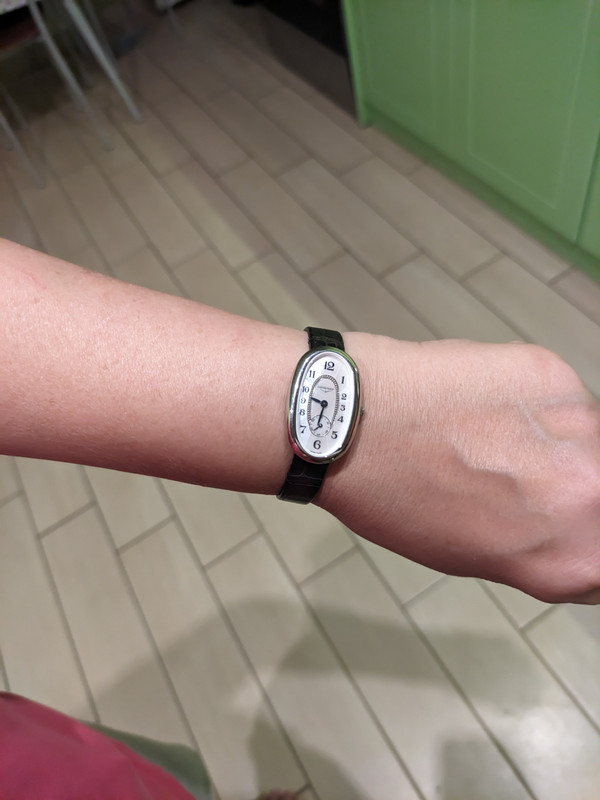 Το ρολόι λοιπόν έχει όντως μουσική ιστορία και το ένστικτο της συζύγου ήταν σωστό, για μια ακόμη φορά. Είναι ένα κλασικό λεπτό ρολόι με κάσα από ατσάλι και μηχανισμό quartz. Tο κάδρο έχει αραβικούς αριθμούς, οι οποίοι είναι τυπωμένοι σε ισάριθμες μικρές πλάκες από mother of pearl. Οι πλάκες αυτές εφάπτονται μεταξύ τους και ακολουθούν το οβάλ σχήμα της κάσας. Στην τωρινή ιδιοκτήτρια θύμισαν, με την αντίθεση του λεπτού μαύρου δερμάτινου λουριού, κλαβιέ πιάνου. Περιττό να πω ότι ενθουσιάστηκε με το ρολόι και χαίρεται να το κοιτά. Ακολουθούν μερικές φωτογραφίες από το κινητό. Το καντράν ειδικά, δύσκολα το πιάνει ο φακός.