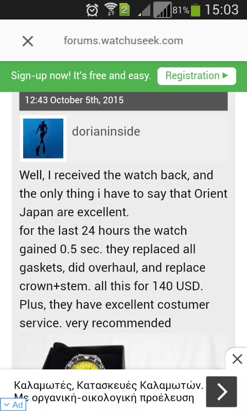 Εγω αγαπητε διαβασα τι λες απλα λεω οτι αν θελεις σερβις στην ιαπωνια ειναι εφικτο . Εδω οταν ερχεται η ωρα συγκρισης δυο ρολογιων η πρωτη δικαιολογια ειναι που θα το κανεις σερβις λες και θα πας στο φεγγαρι.... επισης ενα gs που εστειλε japan για σερβις απο ξενο φορουμ μαζι με γυαλισμα κασας θα το βρω και θα το ανεβασω νομιζω κοστισε 600 ερω και ρωτω .αν ενα gs κανει 4500E και ενα xελβετικο κανει 10000 E ιδιας ποιοτητος ..... θα παρω το ελβετικο γιατι το αλλο που θα κανει σερβις? ειναι αυτο λογικη ?η ειναι νορμαλ φιλου tissot seastar 1000 χρονογραφος να κανει σερβις 1100 ευρω ενω το τολοι αγοραστικε 1000?