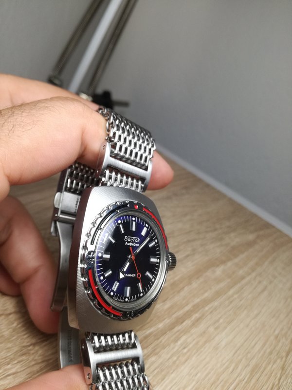 Και κάτι πιο παλιό!Είχα βρει πριν καιρό το dial στο ebay, έμενε να βρω και ένα σοβιετικό vostok amphibia 119. Βρέθηκε και σε καλή κατάσταση και με το δικό του κρύσταλλο (λογικά..). Πλύθηκε, βουρτσίστηκε, γυαλίστηκε, σενιαρίστικε, έγινε η αλλαγή του dial και μιας και έχει 18mm lug width έκανα μια "πατέντα" στο mesh με τα Hlinks που είναι 18mm και πιστευω έκατσε μια χαρά.Έχει τον 2209 κουρδιστό μηχανισμό με 18 jewels που παρά τα χρόνια του εδώ και 10 ημέρες πάει μια χαρά και με παραδόξως πολύ καλή χρονομετρία.Κάποια στιγμή μένει να παραγγείλω κατι paddle hands που έχει ο favinov.