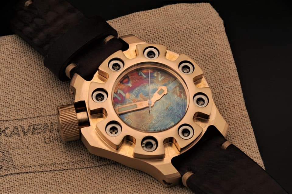 Το εργαστηρι του Michael 'Kaventsmann' Fernandez εχει παρει φωτια εδω και 2-3 μηνες, προφανως λογω του εορτασμου των 10 χρονων του brand. Μπρουτζινο και ατσαλενιο Triggerfish, μπρουτζινο Kofferfisch (η πρωτη του -νομιζω- τετραγωνη κασα) και σειρα παιρνει το Bruno, το εντυπωσιακοτερο για μενα Kaventsmann που εχει βγει ποτε. Η επανεκδοση του ερχεται με ανανεωμενα 26αρια lugs που ταιριαζουν περισσοτερο στην 52αρα (!!!) κασα του.
