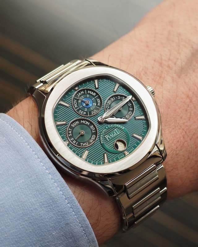 the Piaget Polo Perpetual Calendar Ultra-thin in steel with emerald green dial