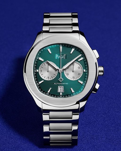 The Piaget Polo Chronograph in steel with a “reverse panda” emerald green dial