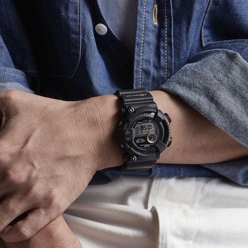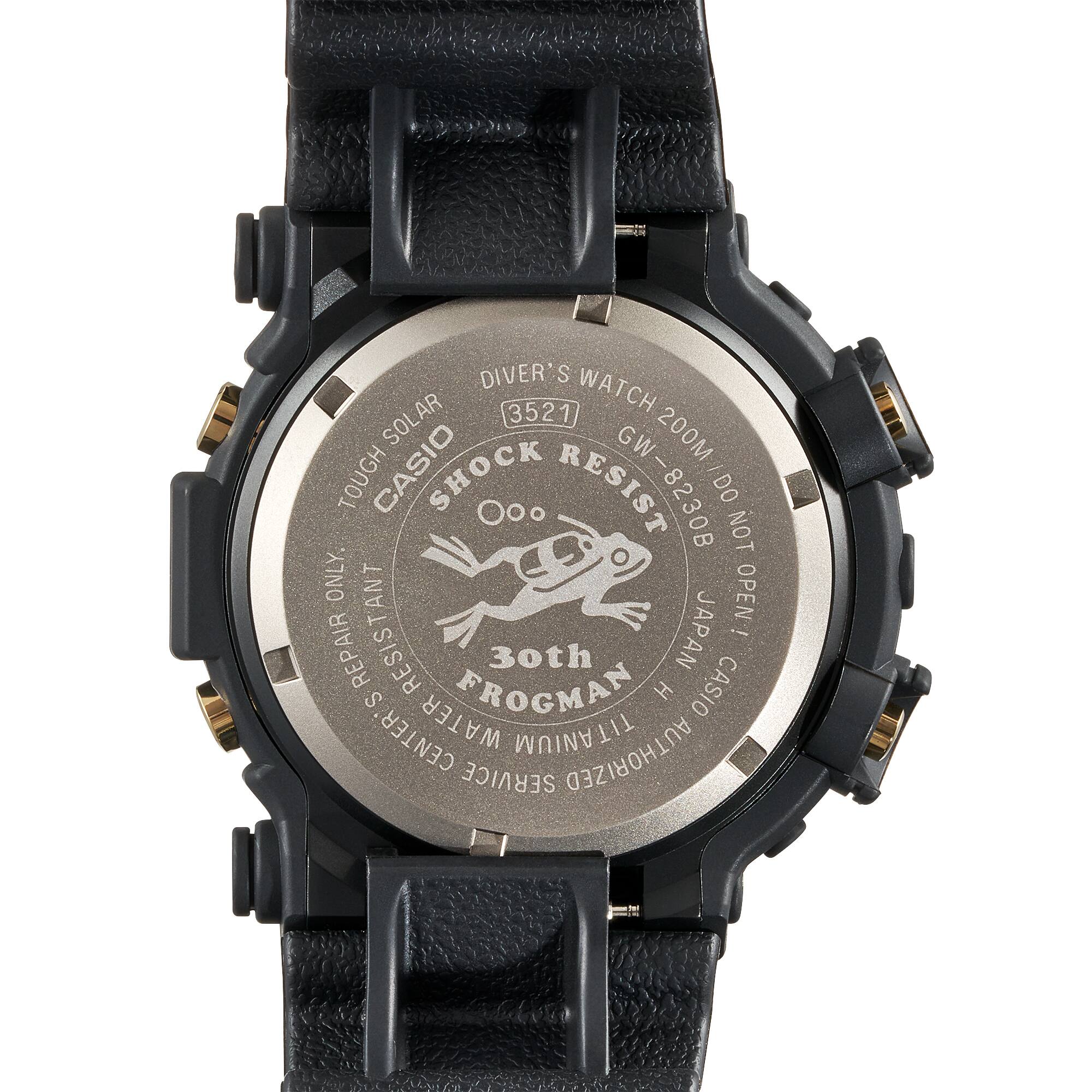 This limited edition reprises the a popular DW-8200B-9A black and gold color scheme while adding high-tech functions to bring state-of-the-art 21st century technology to 1990s design. The back of the titanium case and the LED backlight both display a special Frogman 30th anniversary design.
