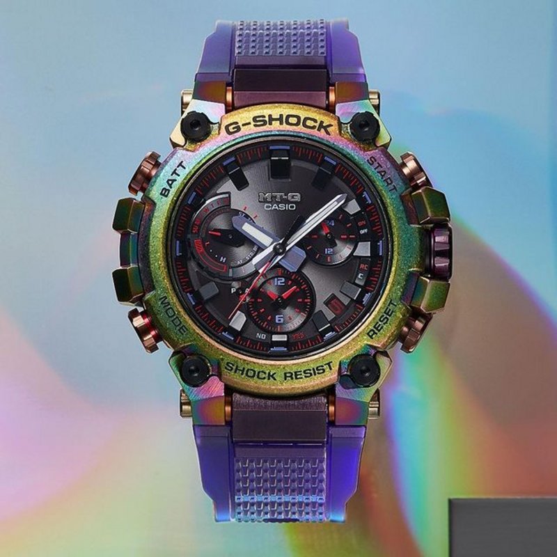 This time, it’s given the NASA treatment to the DW6900: the resin case and band are rendered in a white case, the “NASA” logo is on the bottom strap, and the stars and stripes are emblazoned on the strap holder. The backlight, when glowing, displays an image of the Earth. It’s a limited edition (Casio doesn’t say how many)