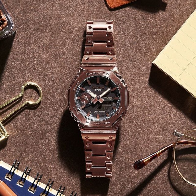 GM-B2100 Luxe full-metal construction with a screw-back case, bezel, and band crafted in stainless steel creates a streamlined, minimalist design, while protecting the module from impact when dropped. We take it way back with the octagonal bezel and dimpled band design of the original from 1983, all done in metal