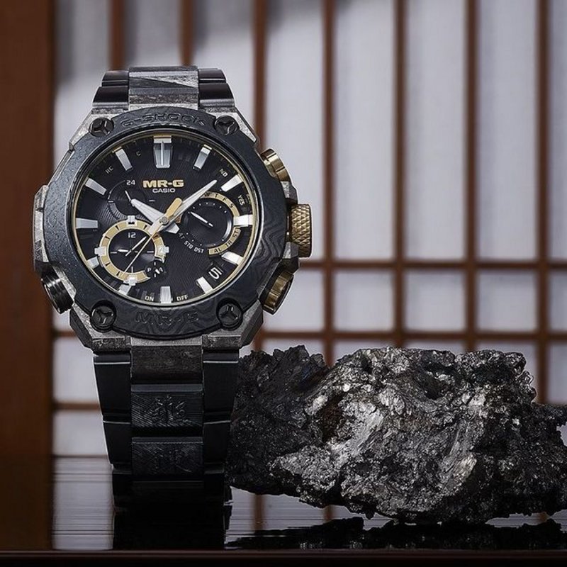 The MRG-B2000GA celebrates both artisan elements and modern-day techniques all in a singular Japanese sword-inspired timepiece. Created in collaboration with one of Japan's leading swordsmiths Sadanobu Gassan, this latest release from the MR-G lineup introduces a hybrid titanium bezel that evokes the look of the Gassan family’s signature Ayasugi Hada pattern, combining forging techniques used for Japanese armor and copperware with traditional colors favored by Samurai warriors