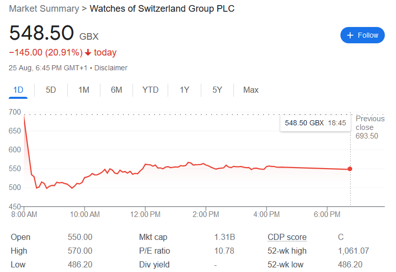 Τρίτον, η μετοχή της Watches of Switzerland, μεγάλου Rolex AD, ήταν εχθές κάποια στιγμή στο μείον 25%...