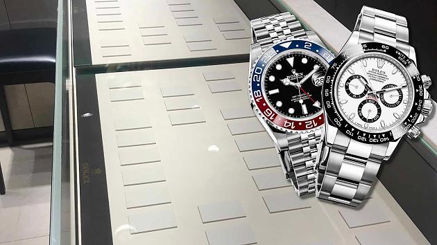 No, no robbery has taken place here. This is just a current picture of a sold-out Rolex showcase at Bucherer on Residenzstrasse. Right in the picture: the Rolex GMT-Master II made of stainless steel, which is sold out worldwide (left) and the Rolex Cosmograph Daytona made of stainless steel.