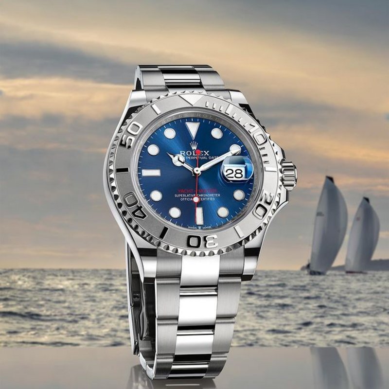 The Yacht-Master 40 in a Rolesium version features a rotatable bezel crafted in platinum, and a case and bracelet made of Oystersteel. Its distinctive red seconds hand echoes the ‘Yacht-Master’ inscription on the bright blue dial and ensures legibility. As in sailing races at the highest level, every second counts and winning boils down to precision