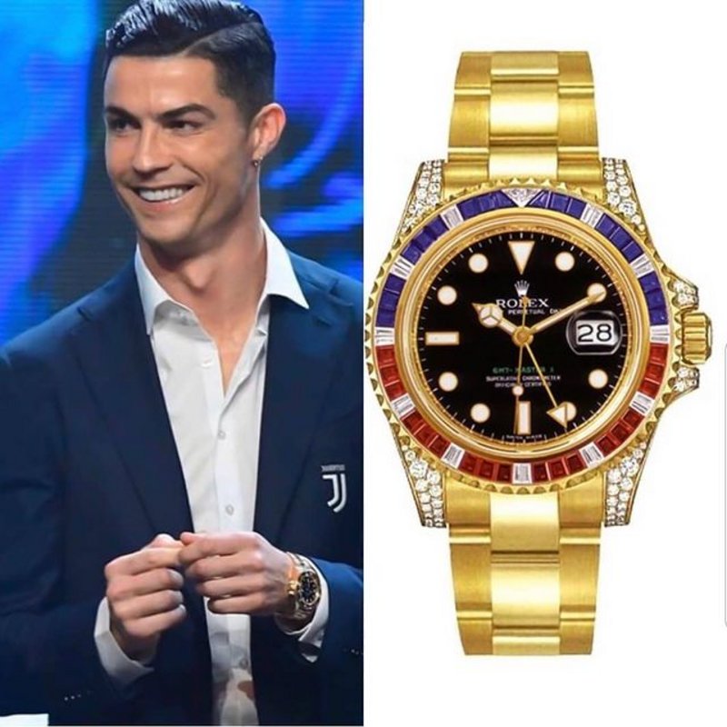 Portuguese football legend @cristiano spotted with a 18ct Yellow Gold @rolex GMT-Master II with 36 Diamonds and 12 black Sapphires set on the bezel
