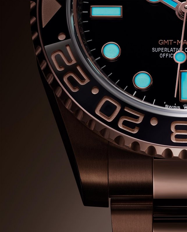 Black for night-time hours, brown for day-time. The GMT-Master II’s rotatable bezel is equipped with an insert crafted from high-tech ceramic, divided into the two colours and featuring a 24-hour graduation