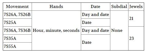 Like most Seiko movements, the 7S26 family operates at 21,600 vph. All models feature sweep hour, minute, and seconds hands. The 7S26 and 7S36 feature both day and date in a window, while the 7S25, 7S36 and 7S55 have only a date window. The 7S26 and 7S25 have 21 jewels while the 7S35, 7S36, and 7S55 have 23 jewels. The 7S55 is identical to the 7S35 except for a rotor decorated with Tokyo stripes for limited use in a line of Seiko 5 Superior watches from the late 1990's.