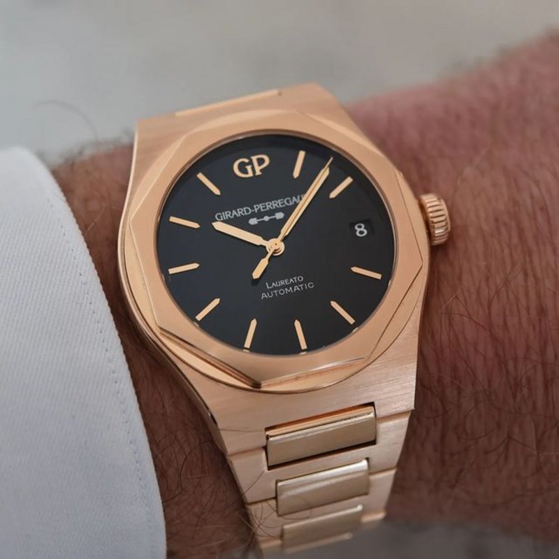 girardperregaux Laureato 42. Presented in 18 carat pink gold case and bracelet, with a brushed and polished finish, the dial is made of black Onyx and really lures you in