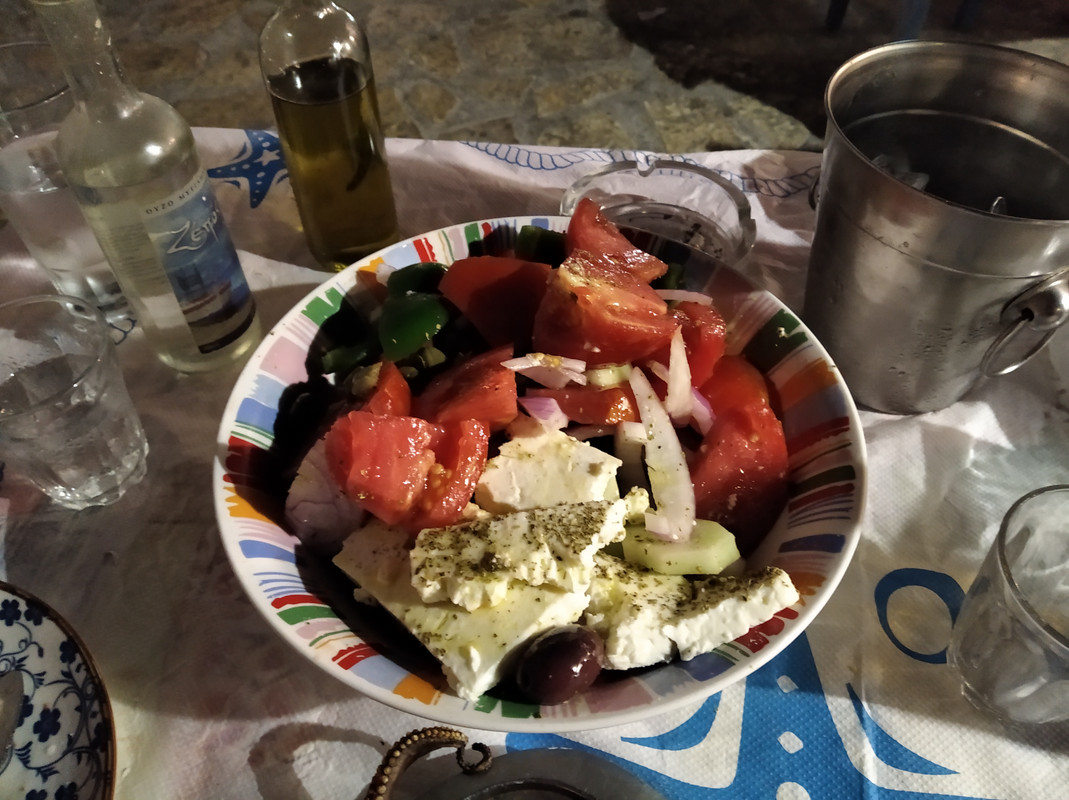 Σαλάτα που τρώνε 4, φρεσκοκομμένη, όλα από το μποστάνι + φέτα + κάπαρη, καλαμαράκια τρώνε 4, πατάτες τραγανές πιατέλα ολόκληρη. 2 μπύρες, 1/4 κρασί, νερό μεγάλο, ψωμιά, κλπ.,