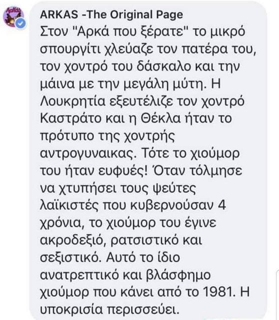 Να μην ξεχασουμε βεβαια την σιχαμενη περιφερειαρχη που ετυχε μια στραβη στη βαρδια της και που ειχε το θρασος αλλα και την στηριξη του αληταρα για να ξανακατεβει στις εκλογες και να βγει και δευτερη.Τεσπα την σελιδα του Αρκα την εριξε το FB λογω συνεχων αναφορων(σιγουρακι απο Συριζοτρολ)η ψεκασμενους