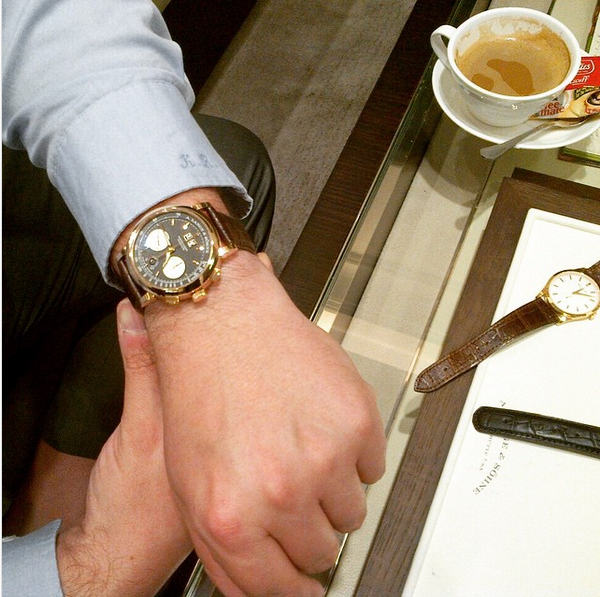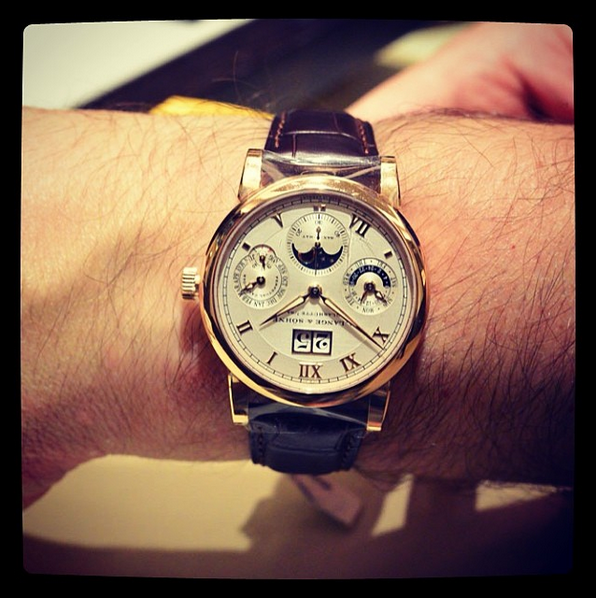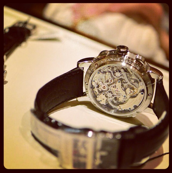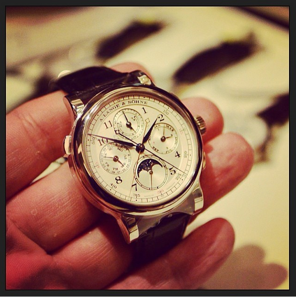 Είναι το Lange 1815 Rattrapante platinum. Βγαίνει σε ροζ χρυσό και πλατίνα, διηνεκές και χρονογράφος μαζί. Η παρουσία που επιβάλλει αυτό το κομμάτι είναι ασύλληπτη όταν το έχεις μπροστά σου. Έχω δει και πιάσει ΡΡ 5270, 3970, αλλά εδώ έμεινε η καρδιά μου. Τρεις-τέσσερις μέρες από τότε που το είδα, το πήρε κάποιος (?) Μου είπαν μετά από τη μπουτίκ πως ήταν αυτός που έχει την L'Occitane αντιπροσωπεία στην Ινδονησία, είναι λέει συλλέκτης κι έχει περί τα 40 κομμάτια Lange.