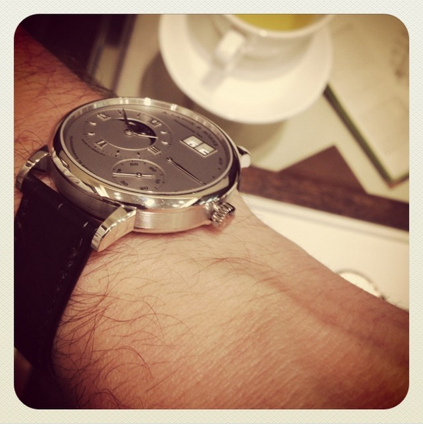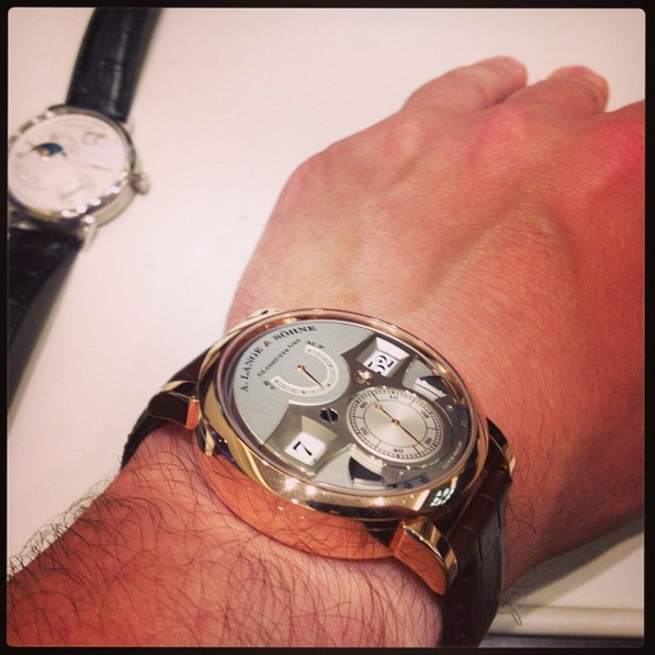 Έχω δοκιμάσει επίσης όλα τα λοιπά βαριά κομμάτια, λ.χ. το Terraluna που έχω εδώ, όπως και το Zeitwerk. Κάθε χρόνο μετά την παρουσάιση των νέων references, μας έστελνε η μπουτίκ της Lange πρόσκληση, καθ'ότι τα νέα κομμάτια τα γυρίζουν σε όλες τις μπουτίκ ανά τον κόσμο. Τα περισσότερα ήταν demo pieces, λίγα χωρίς movement. Αλλά είχες καθαρή εικόνα του πώς κάθεται το κομμάτι.