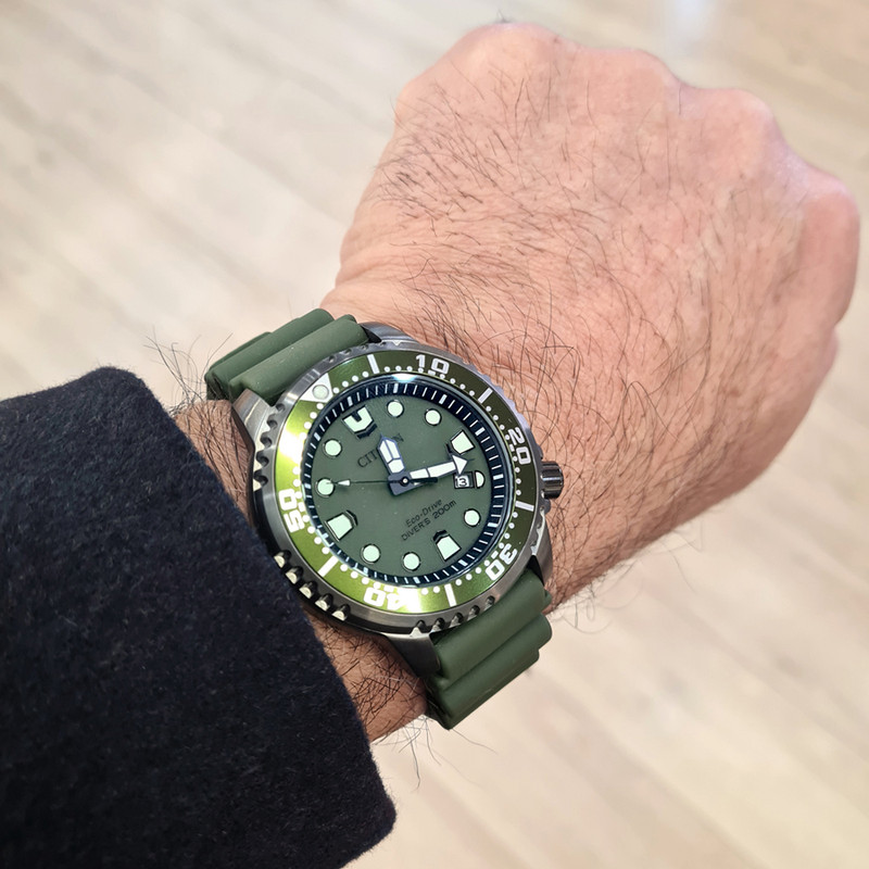 Το  Citizen Promaster  παρά το μέγεθος του έκατσε πολύ καλά. Μου άρεσε και το χρώμα (olive green) που είναι ιδιαίτερο και του πηγαίνει αρκετά καλά.