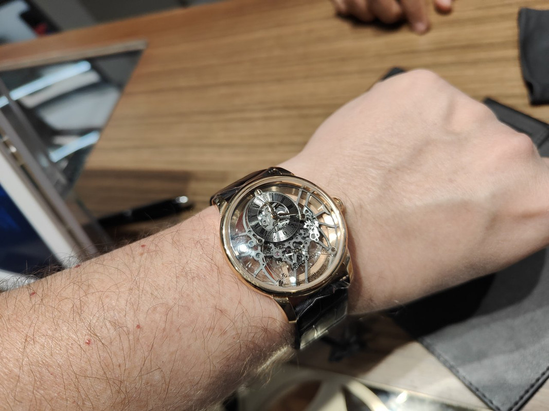 Το κομμάτι αυτό είναι ένα special edition χρυσό skeleton 41 ή 42mm της Ζακέ Ντρο, δεν είναι Limited Edition, δεν ξέρω μοντέλο/ref (κι ούτε με νοιάζει διότι ναι μεν είμαι ανοικτός σε exhibition piece αλλά τούτα 'δω τα ρολόγια δεν μου κάθονται και πολύ καλά στον καρπό, συν το ότι δεν μου αρέσει που το λουρί τους είναι πλατύ χωρίς tapering.)