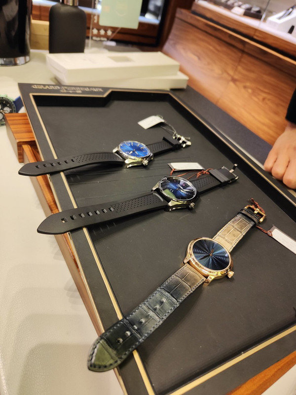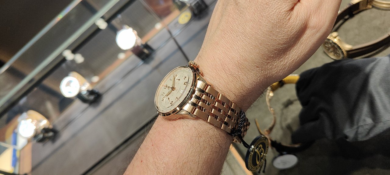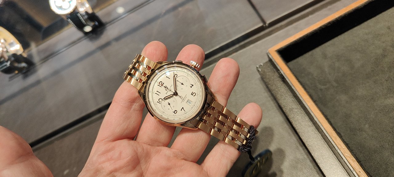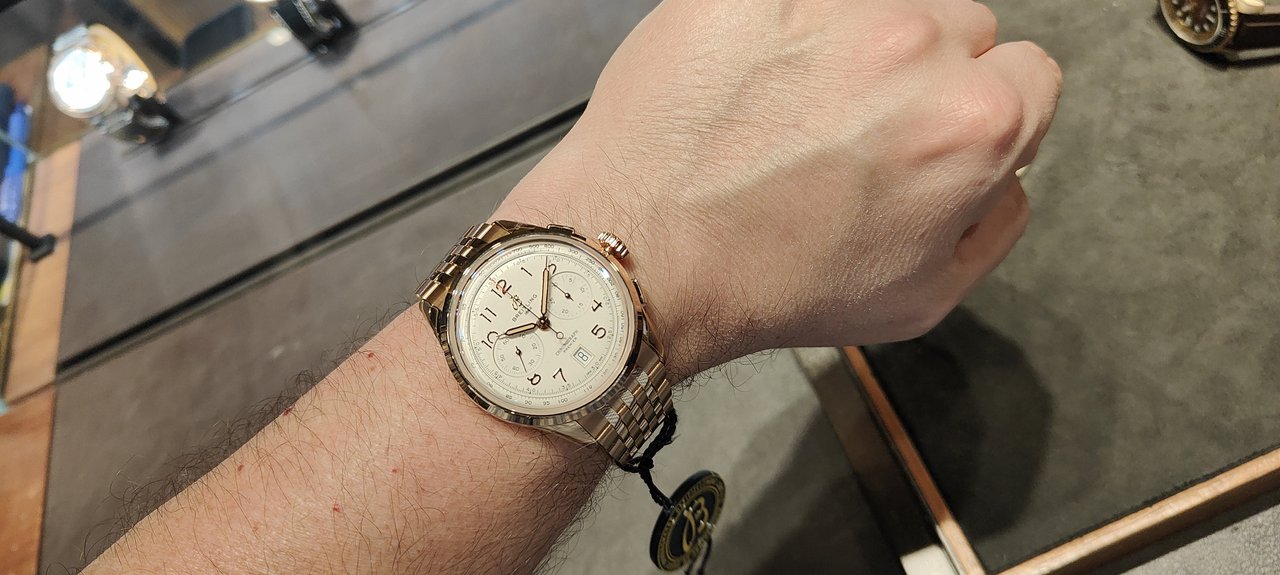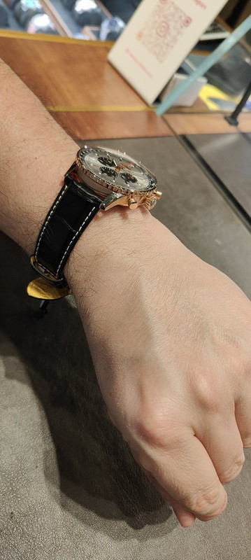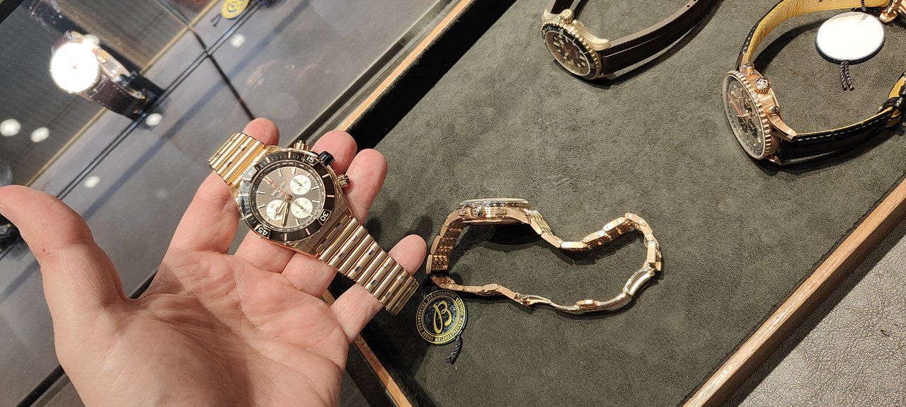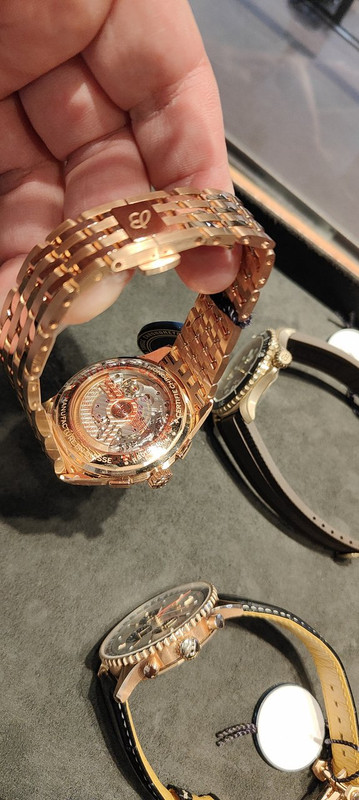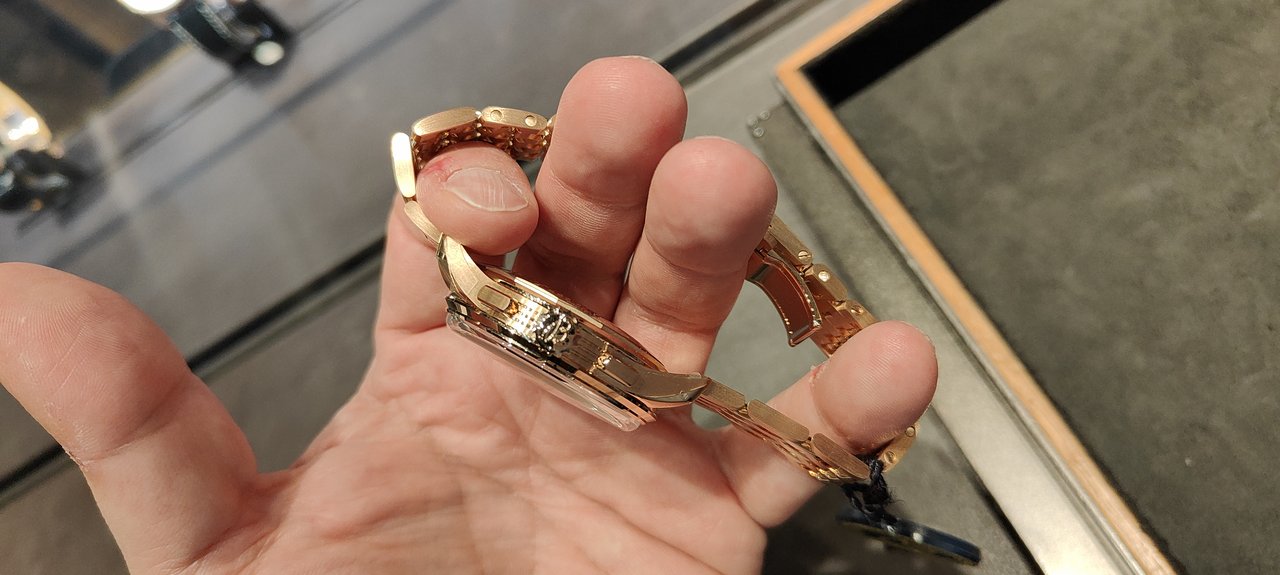 Αυτό το Premier B01 με το χρυσό μπρασελέ (€38,700) το έπιασα, το ψηλάφησα στο μπρασελέ, θα έλεγα αίσθηση παρόμοια με αυτήν του ατσάλινου Longines που έχω (μη smooth edges κλπ.) κάτι που δεν περίμενα αλλά πρώτη εντύπωση είναι, όπως και να το κάνουμε.