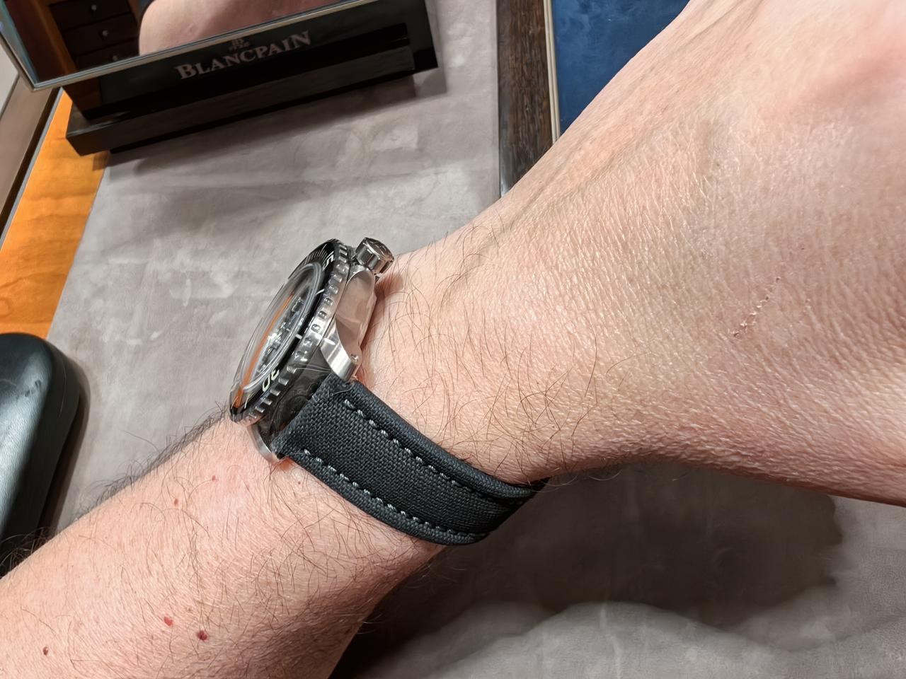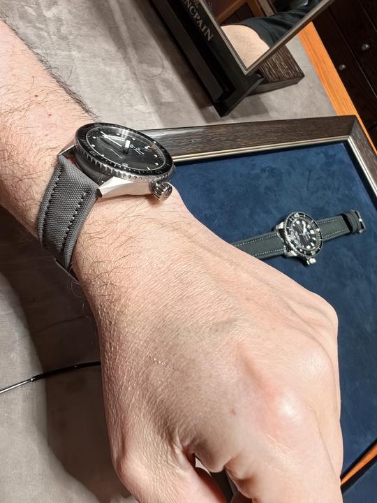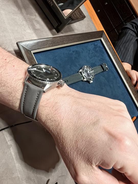 - το Bathyscaphe Titanium 43mm με την ίδια μηχανή (αρκετά πιό φθηνό) σε σκούρο γκρι dial και κρεμ sailcloth strap.
