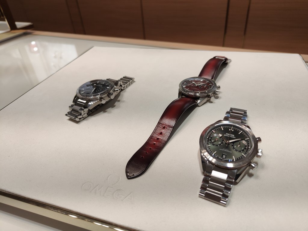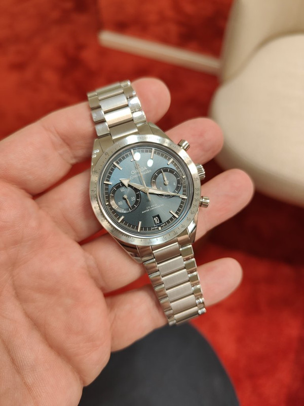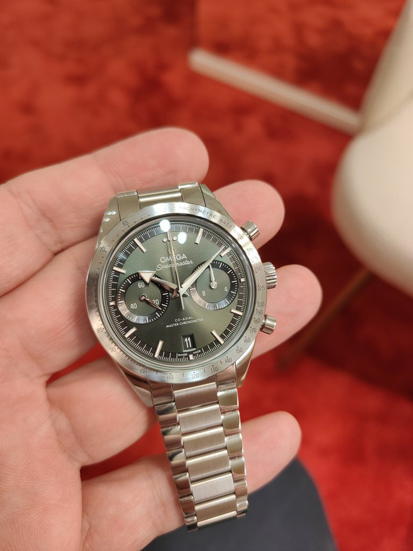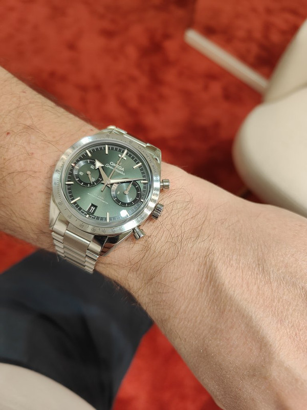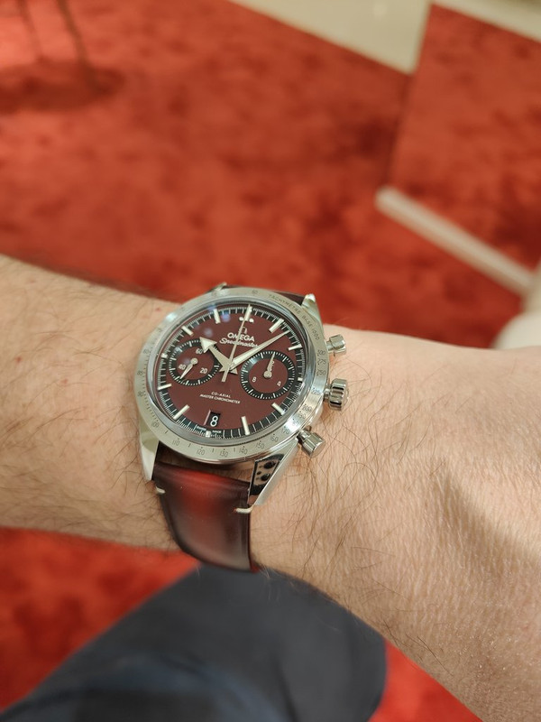 Μόλις βγήκα από τη μπουτίκ της Ω όπου δοκίμασα το Speedmaster '57 40.5mm σε μπλε, πράσινο και κόκκινο dial - μπρασελέ αλλά και δερμάτινο λουρί.Eτοιμάζω τις φωτογραφίες.