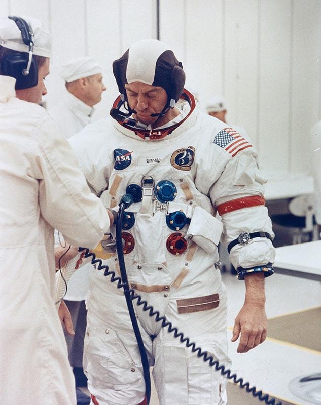 Astronaut Alan Shepard, during pre-launch suit-up for Apollo 14, with Speedmaster.