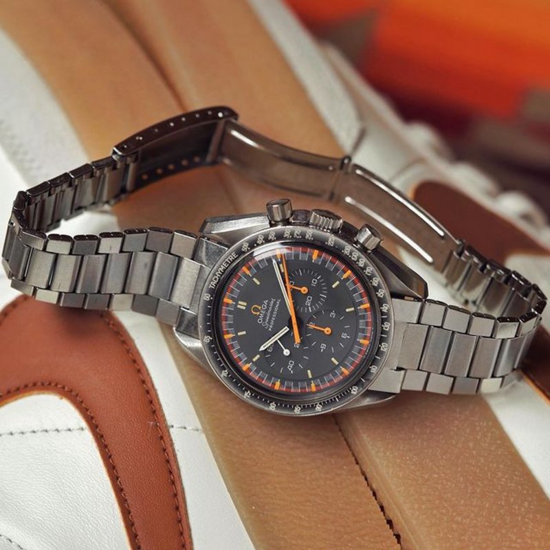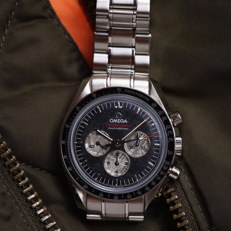 2010 35th Apollo-Soyuz the fist Speedmaster with Meteorite dial ! With a dial and subdials made from slices of meteorite, this Speedmaster was built from a real piece of space. It commemorates the historic moment when astronaut Thomas P. Stafford (USA) and cosmonaut Alexei A. Leonov (USSR) shook hands in space in 1975. The caseback features two spacecraft from both the USA and the Soviet Union and the names of the cosmonauts and astronauts involved