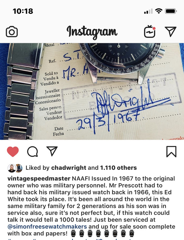 Χορηγηθέν από την ΝΑΑΦΙ το 1967 στον αρχικό ιδιοκτήτη που ήταν στρατιωτικό προσωπικό. Ο κος Πρεσκοτ, έπρεπε να επιστρέψει το χορηγηθέν από την στρατιωτική υπηρεσία ρολόι το 1966, ο Εντ Γουαιτ πήρε την θέση του. Πήγε .... ....με την ίδια στρατιωτική οικογένεια για 2 γενεές μια και ο γιός του υπηρετούσε , σίγουρα δεν είναι άριστο, αλλά, αν το ρολόι μπορούσε να μιλήσει κλπ, κλπ.