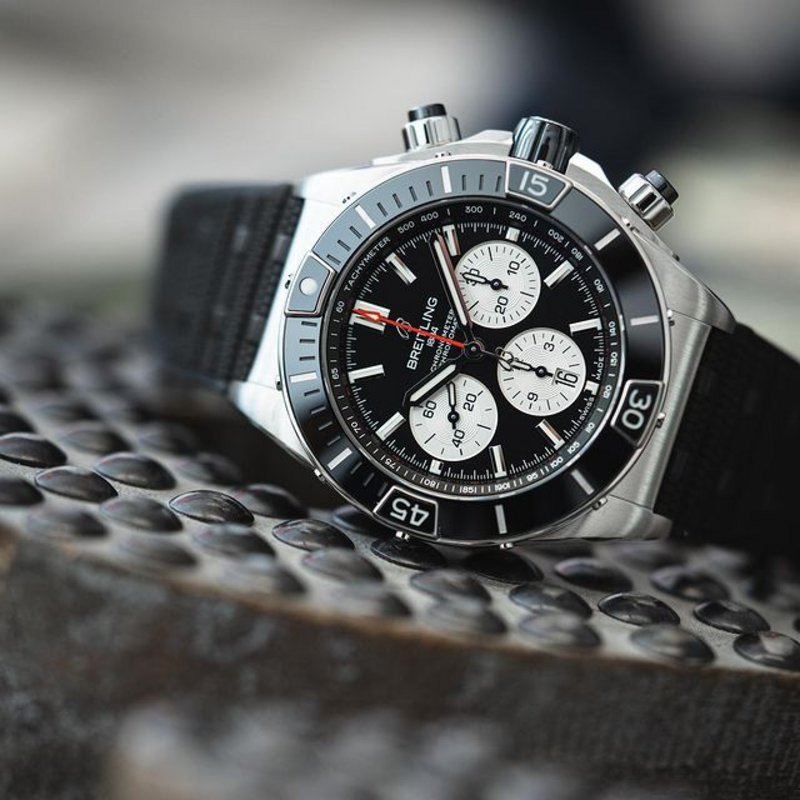 The Breitling Super Chronomat B01 44 features several ceramic inserts – on the bezel, on the chronograph pushers and on the crown