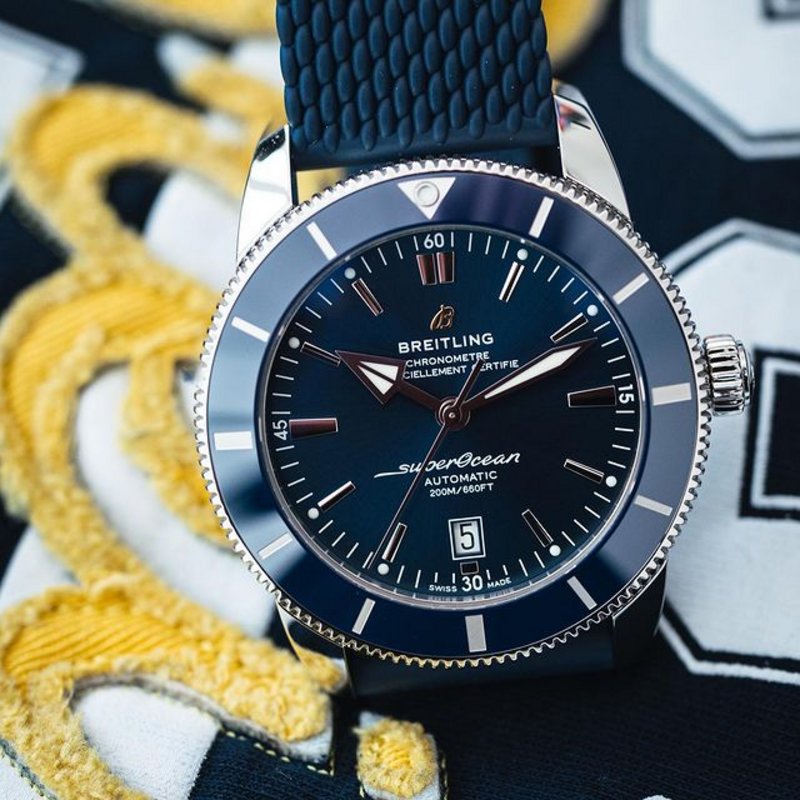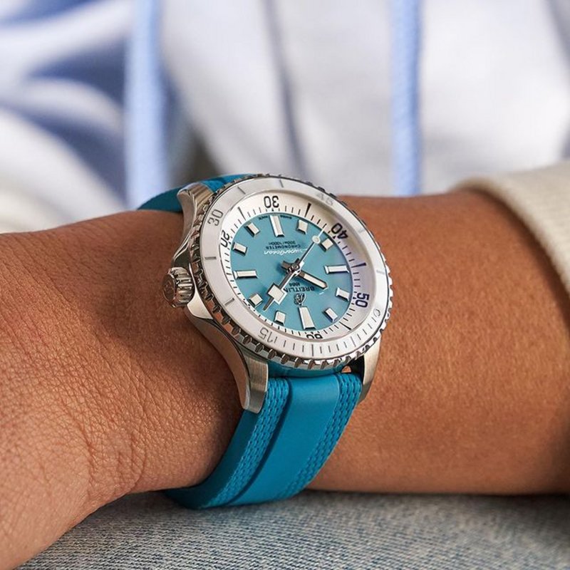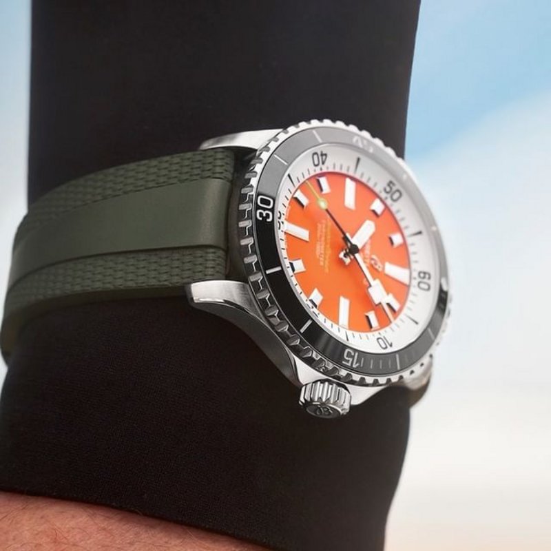In the all-new Breitling Superocean, a circle near the tip of the second hand gives a wink to the much-loved original feature - “the dot,” a circular window at 6 o’clock that displayed different colors depending on whether the minutes-based chronograph was engaged, paused, or off
