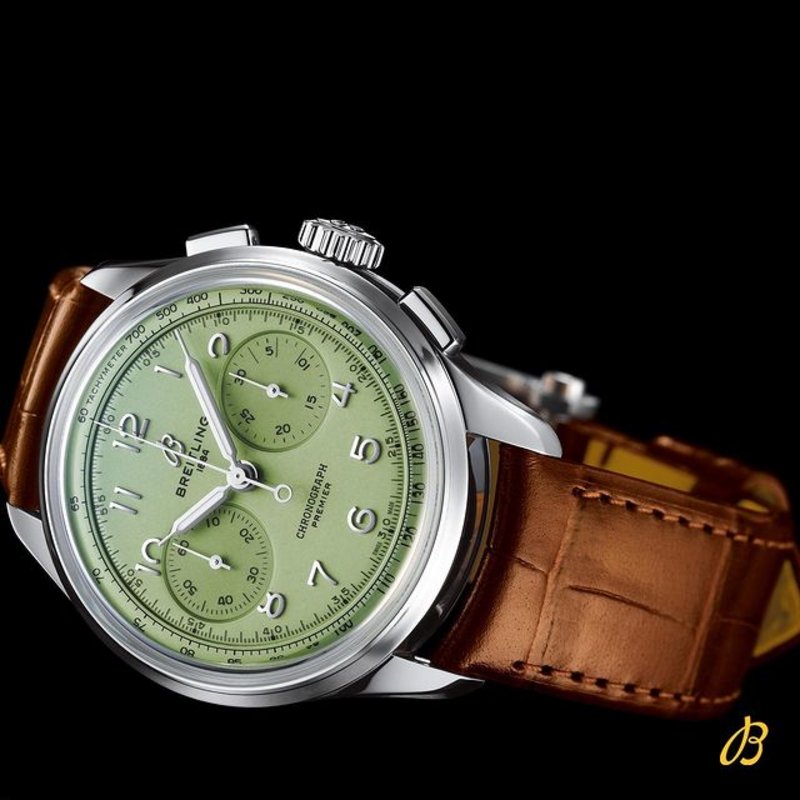 The latest generation of Premier chronographs, the Breitling Premier B09 Chronograph 40, brings its timeless elegance back to life with rectangular chronograph pushers and pistachio green dial