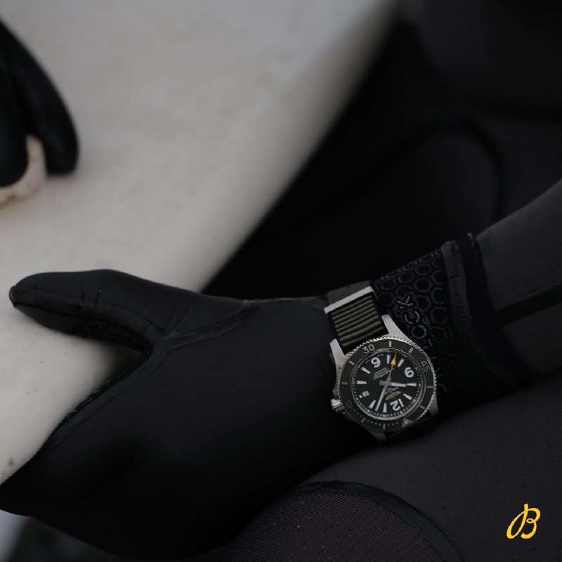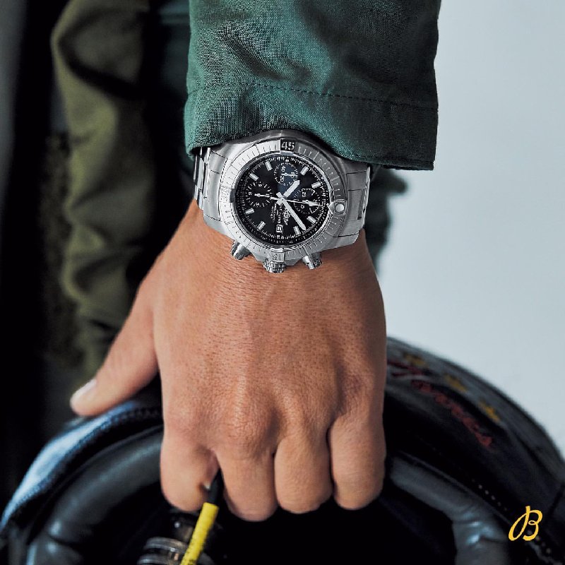 The Super Avenger Chronograph 48 Night Mission is a bold, robust and shock resistant watch which has a strong wrist presence, not only due to the large case dimensions, but also the imposing design. As a true Breitling Avenger, it is designed to be used wearing gloves, featuring a rugged bezel and its special grip-pattern on the crown & chronograph pushers.