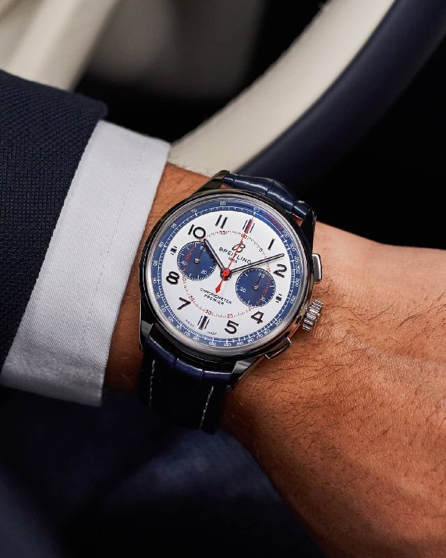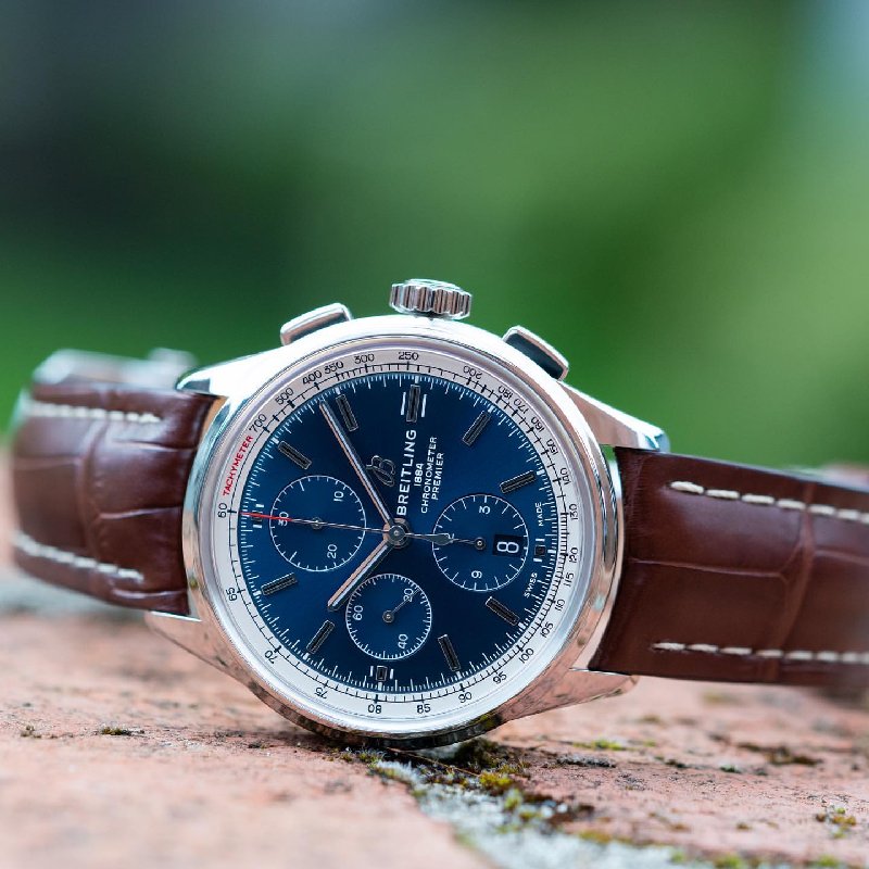 This stunning Breitling Premier Chronograph 42 has a stainless steel case, brilliant blue dial with 30-minute, 12-hour, and 1/4th second chronograph counters at 12 o’clock, 6 o’clock and 9 o’clock respectively.
