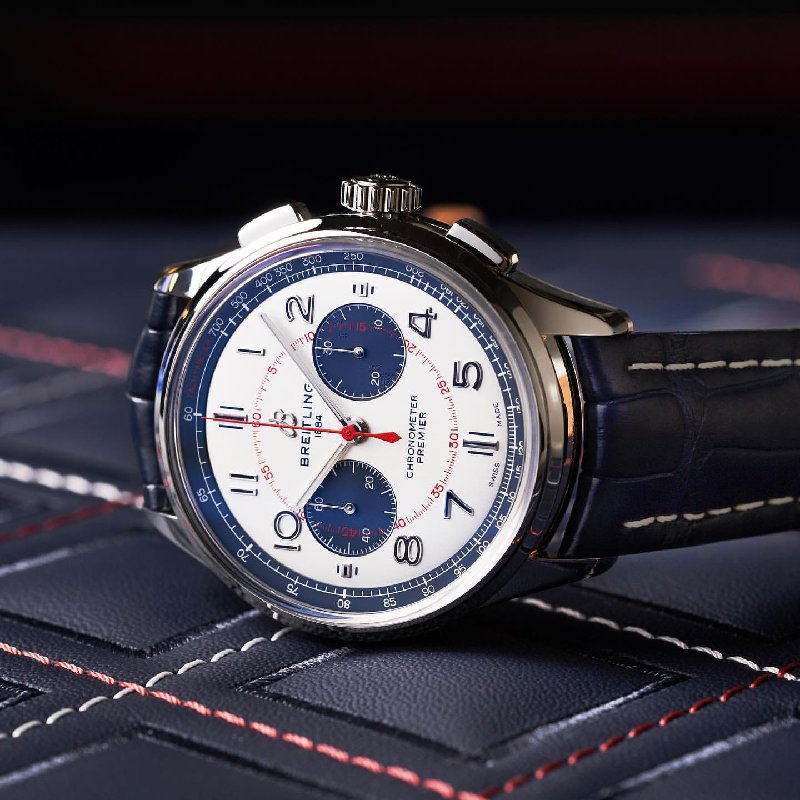 The new Breitling Premier Bentley Mulliner Limited Edition watch has design inspiration from the interior of the Bentley Continental GT Mulliner Convertible, particularly to the Breitling clock in the luxury automobile’s dashboard. The red second hand and centered 60-minute scale match the red stitching found throughout the interior cabin of the Bentley Continental GT Mulliner Convertible