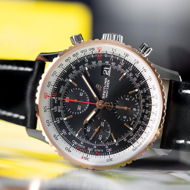 This legendary chronograph is equipped with a self-winding caliber and is chronometer-certified by the COSC, testament to its superior precision and reliability. This Breitling Navitimer 1 Chronograph 41 features a stainless steel case with an 18 karat red gold bi-directional rotating bezel, black dial with tone-on-tone counters on a black leather strap